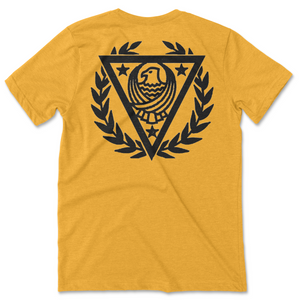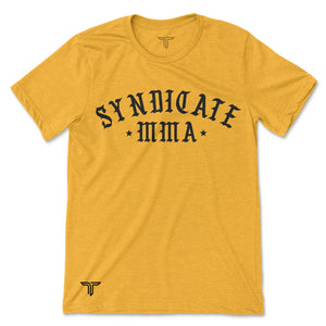 A clean and simple way to represent Syndicate MMA. This gold tee features a bold black logo on the front and a large emblem on the back.