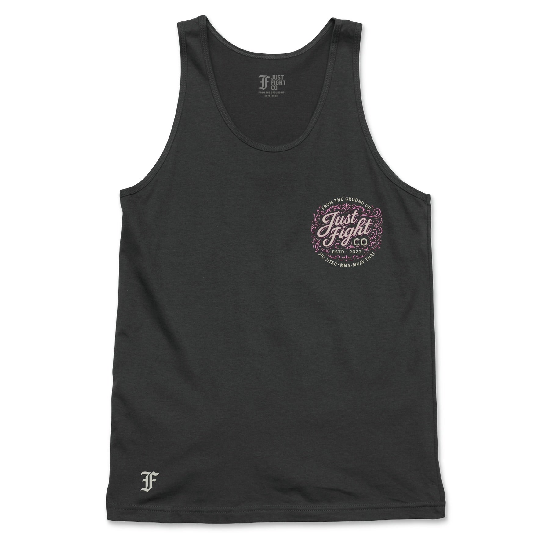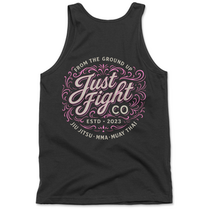 This Just Fight Co. tank keeps things simple, with a clean front chest logo and full-back design in pink and soft cream. Highlighting the roots of the fight game—Jiu Jitsu, MMA, and Muay Thai—it’s a nod to the foundation and the grind.